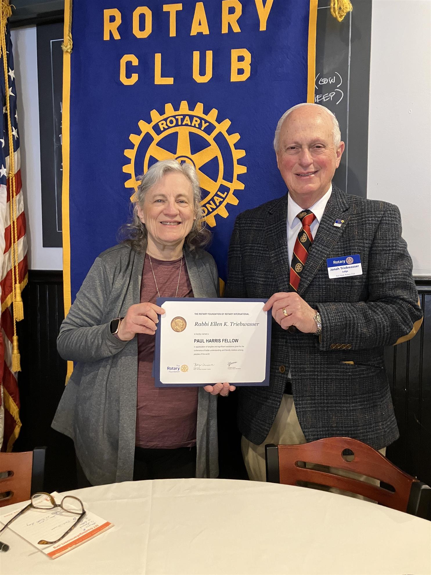Ellen Red Hook Rotary Club President Hon. Jonah Triebwasser honored his wife, Rotarian Ellen Triebwasser, with a Paul Harris Fellowship for her birthday.The Paul Harris Fellow award, established in 1957 by Rotary International and named for the founder of Rotary, recognizes individuals who demonstrate "service above self" and provides support for international, local, and polio-eradication projects. |